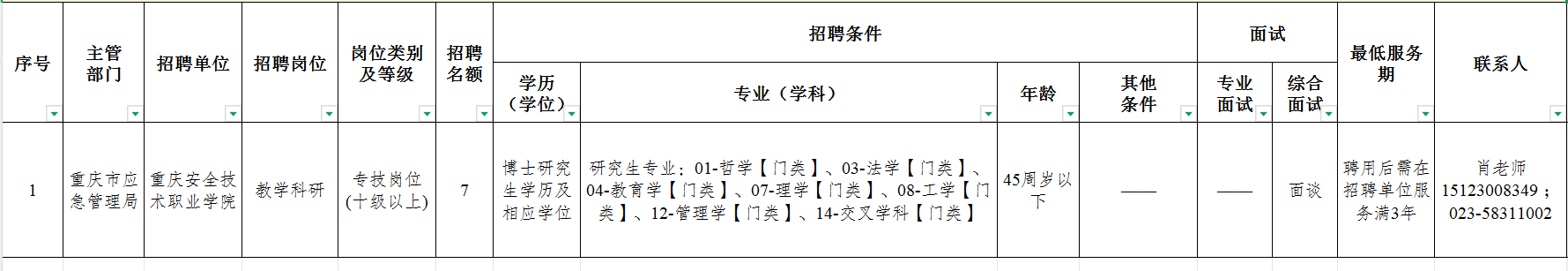 本次考核招聘事业单位工作人员7名,具体岗位条件详见《重庆安全技术职业学院2025年考核招聘事业单位工作人员岗位一览表》(附件1)。